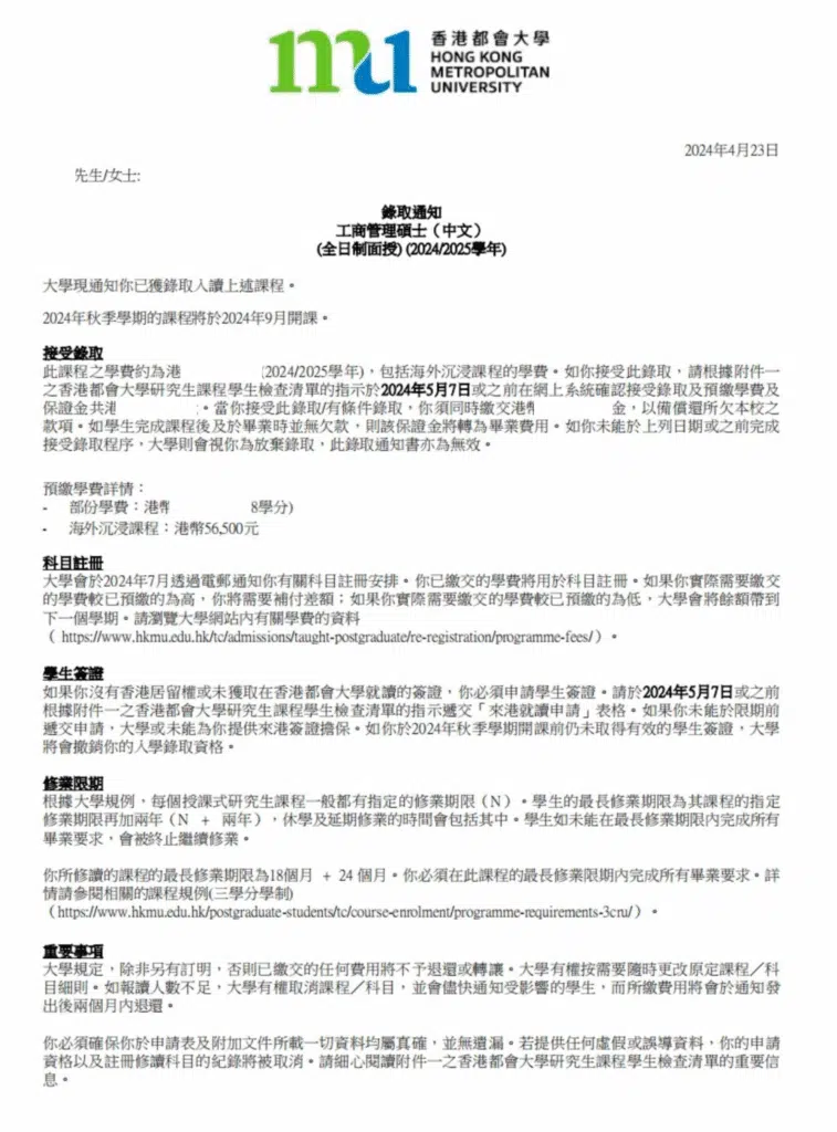 香港进修 | 恭喜Z女士收到香港都会大学录取通知!
